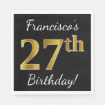This simple paper napkin design features a message like "Francisco’s 27th Birthday!", with the "27th" having a faux gold-like appearance, on a black colored background. The name can be customized. It could be used at a birthday party for somebody who is celebrating their twenty seventh birthday.