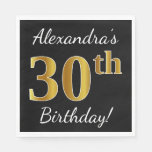 This simple paper napkin design features a message like "Alexandra’s 30th Birthday!", with the "30th" having a faux gold-like appearance, on a black colored background. The name can be customized. It could be used at a birthday party for somebody who is celebrating their thirtieth birthday.